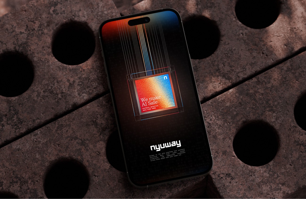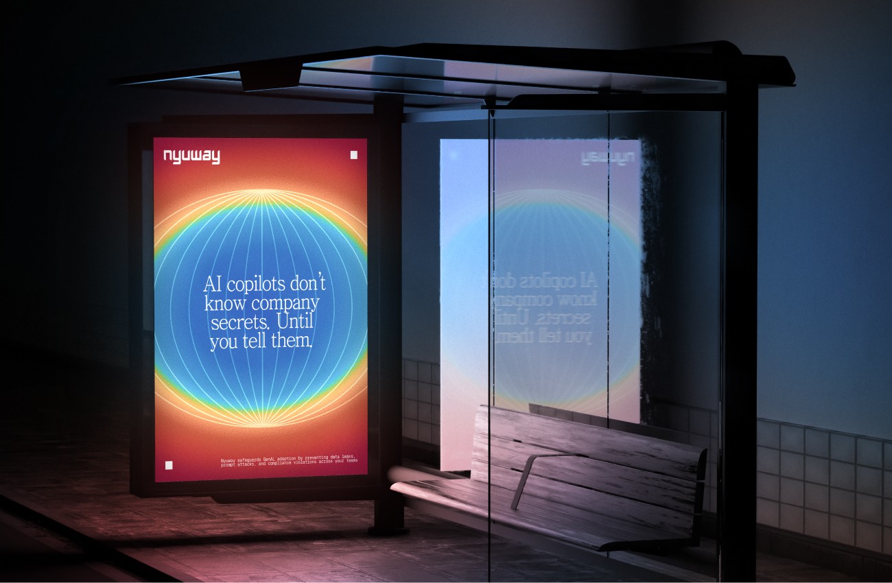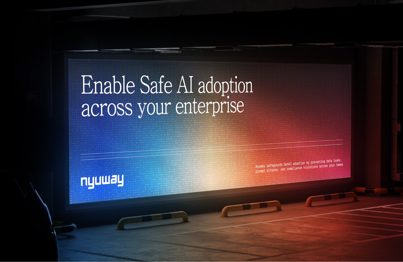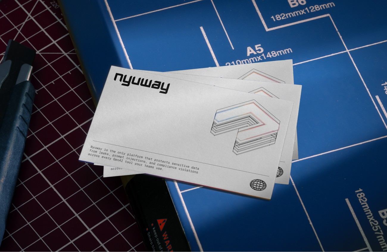 Nyuway empowers enterprises to stay secure by preventing data leaks, shadow AI, and compliance risks across modern AI tools. It's brand identity blends the dynamic energy of matrix-style technographics with the clarity of glass — a visual language of transparency and strength.