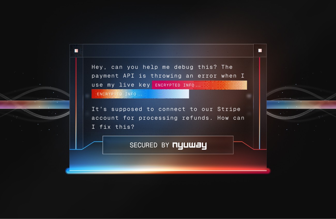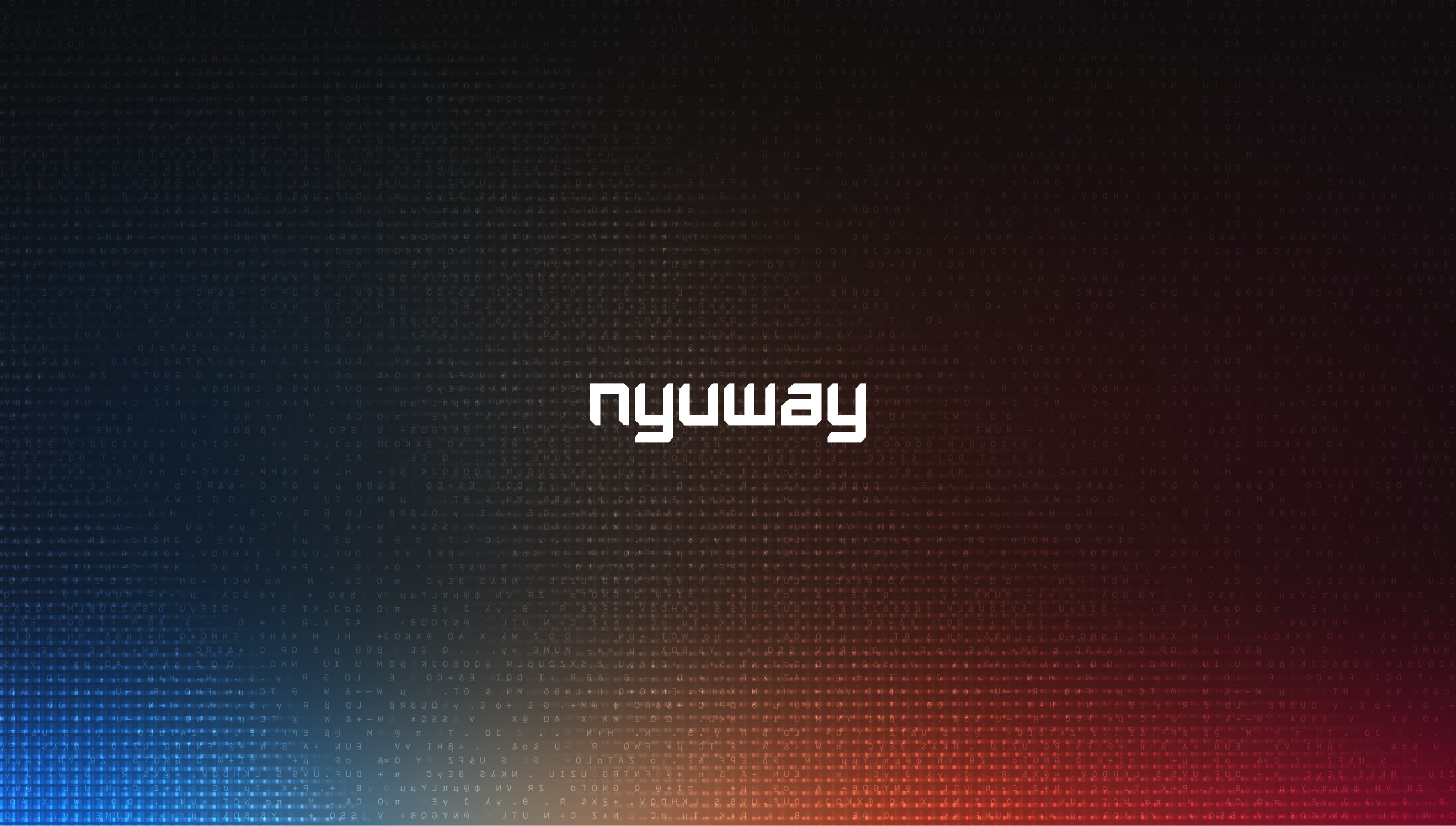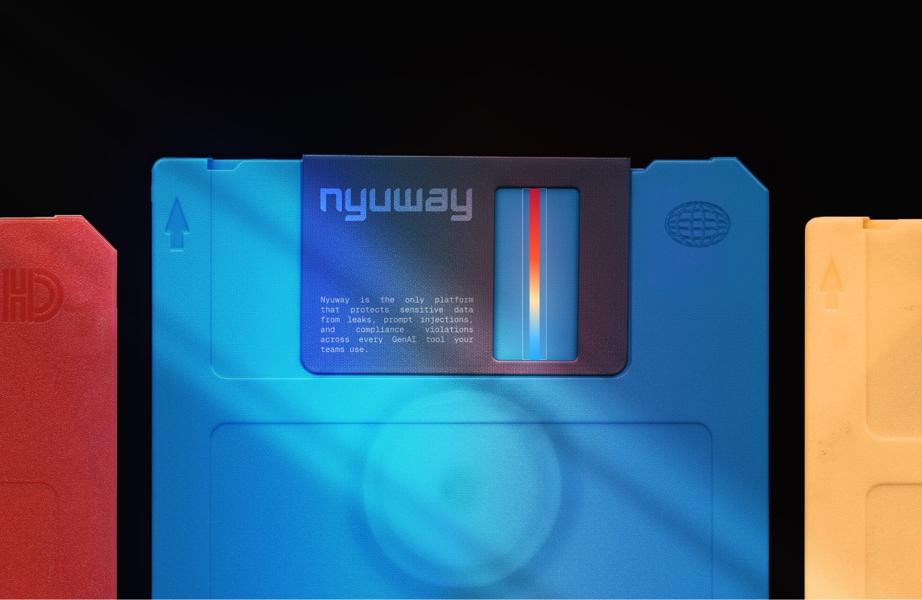 Nyuway empowers enterprises to stay secure by preventing data leaks, shadow AI, and compliance risks across modern AI tools. It's brand identity blends the dynamic energy of matrix-style technographics with the clarity of glass — a visual language of transparency and strength.