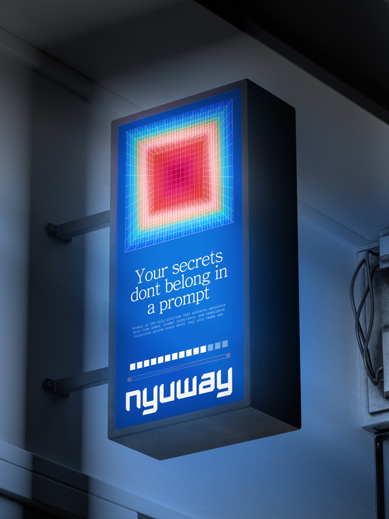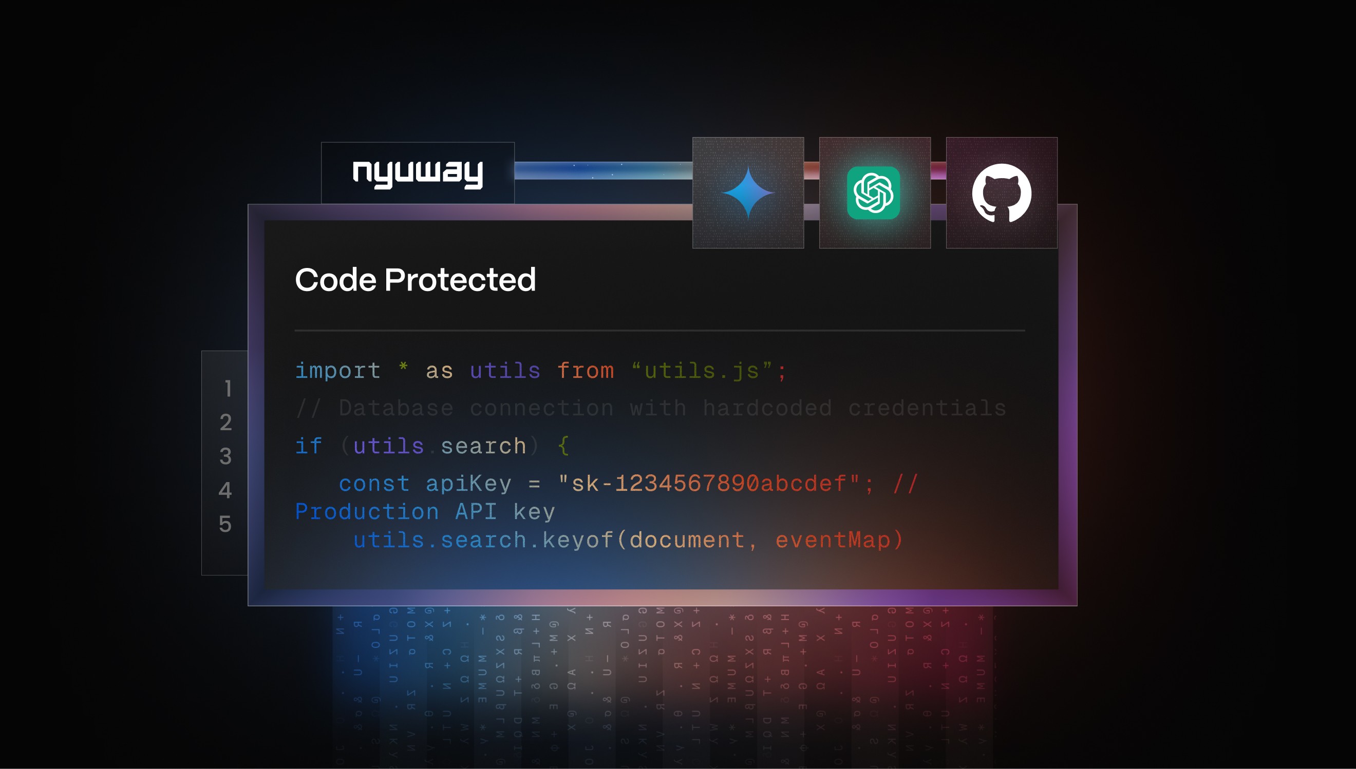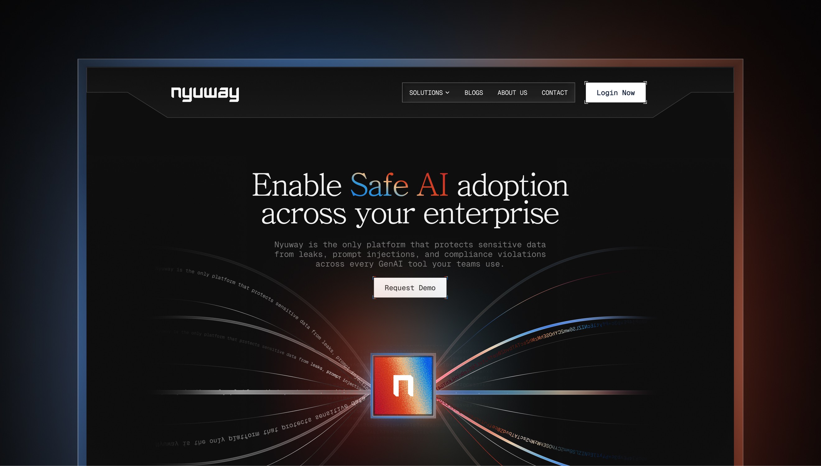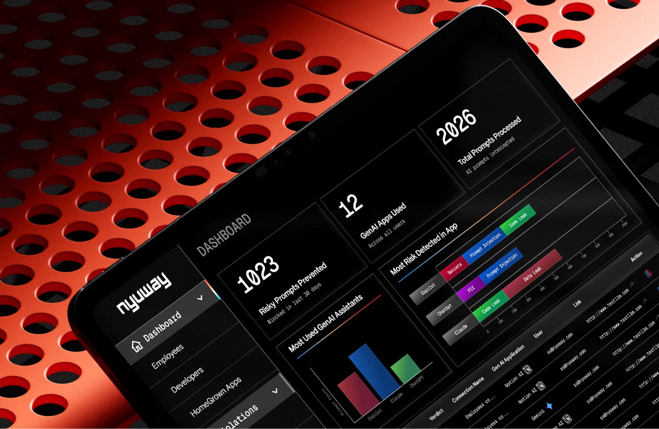 Nyuway empowers enterprises to stay secure by preventing data leaks, shadow AI, and compliance risks across modern AI tools. It's brand identity blends the dynamic energy of matrix-style technographics with the clarity of glass — a visual language of transparency and strength.
